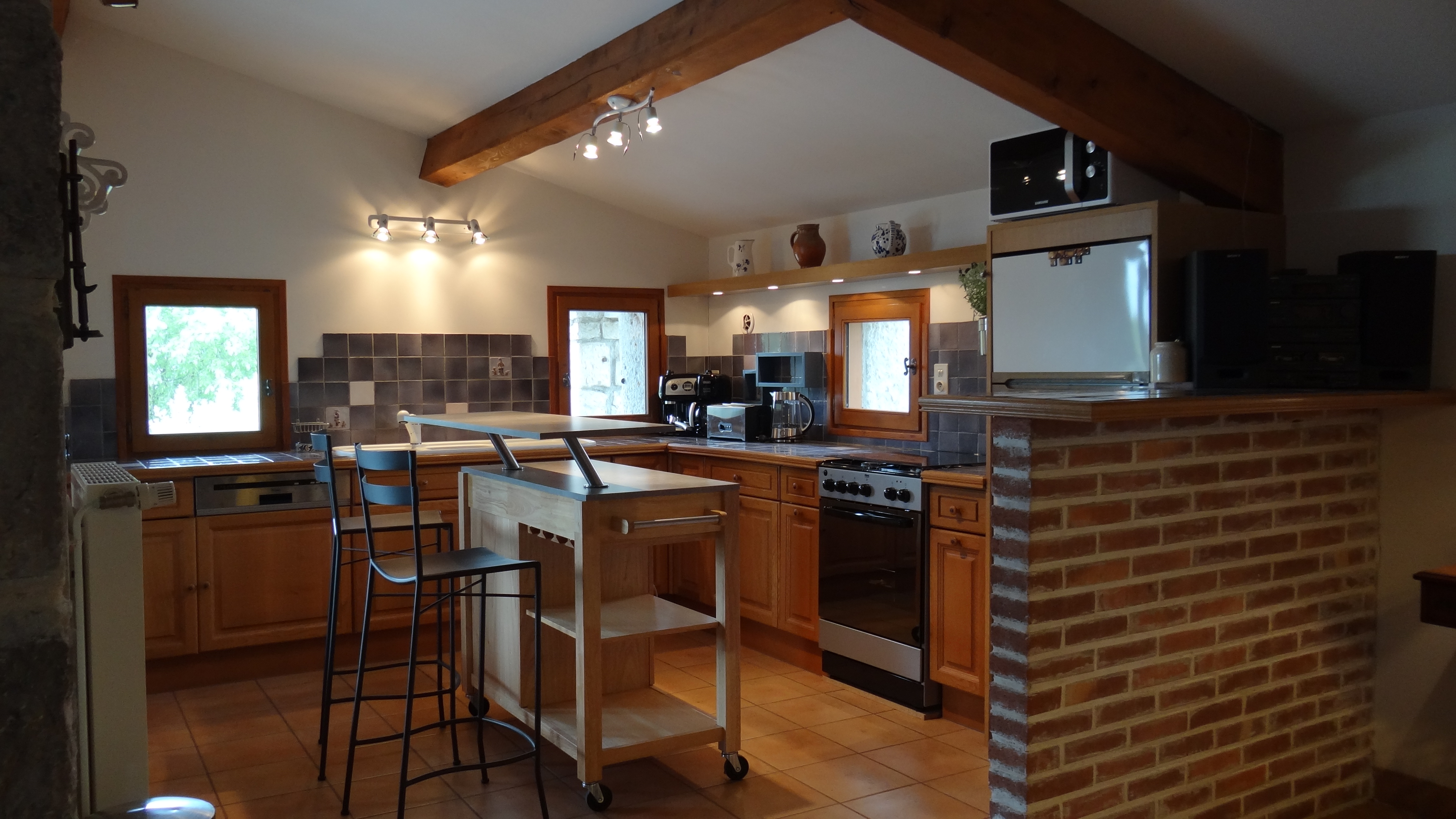 A l’étage vous trouverez également la cuisine tout équipée avec ilot , cuisinière avec four électrique, réfrigérateur et compartiment congélateur, four micro ondes, lave-vaisselle, cafetière multifonctions, etc.