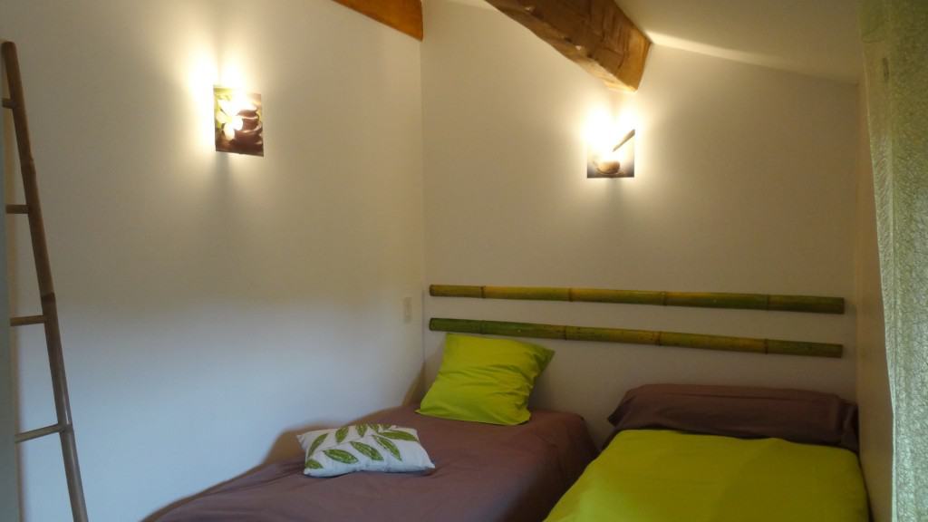 La chambre « Bambou » avec ses deux lits simples 90 x 190. Leur salle d’eau avec douche, lavabo, toilettes.