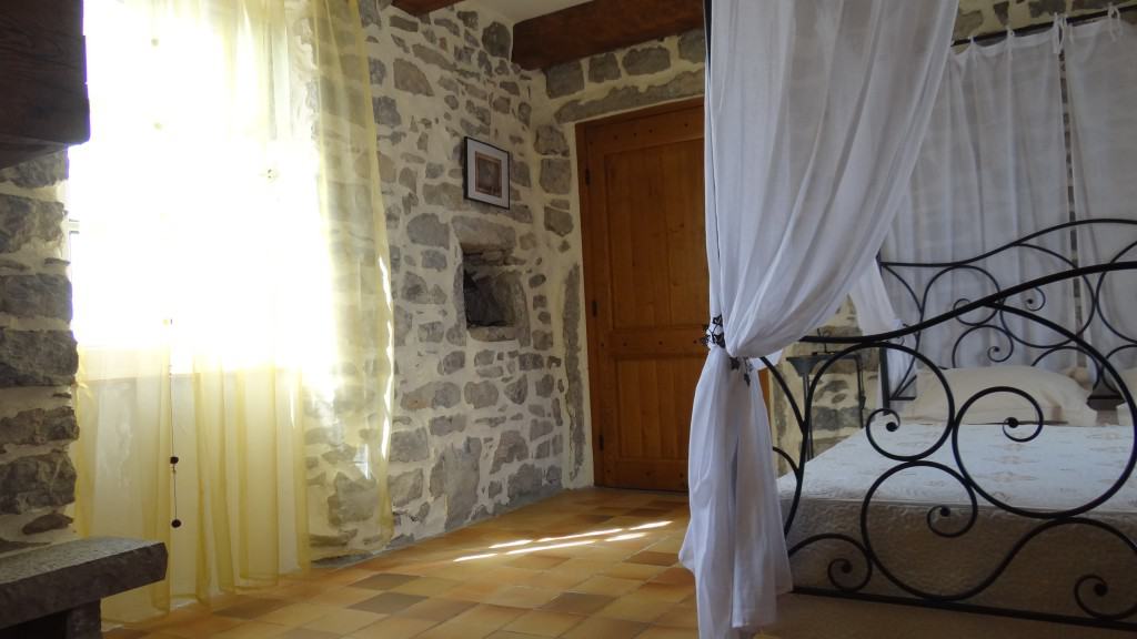 A l’étage, la suite parentale «Oppélia» avec son lit double baldaquin 160×200, sa cheminée,sa salle d’eau avec douche, lavabo et toilettes indépendantes.